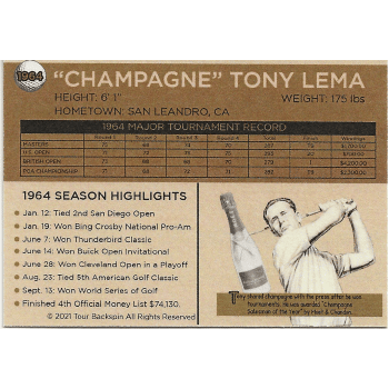 This Tony Lema Trading Card was designed by Tour Backspin to honor a 1960s collecting hobby. Reverse of card lists the wins that Tony Lema achieved in 1964. Limit edition quantities available.